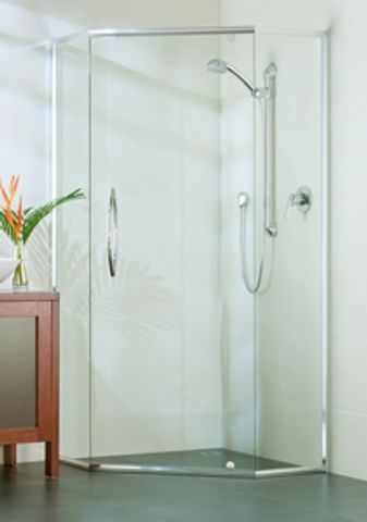 The 45° enclosure better utilises limited bathroom space. This door opening style accommodates the placement of sink and toilet on either side of the shower screen without limiting the door opening.